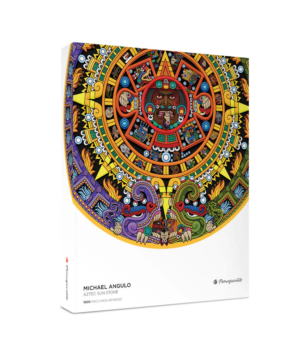 The Sun Stone, a monumental artifact of Mexica heritage, represents their belief in various creation and destruction stages of the world. It depicts a synthesis of time, though its use may have been ceremonial, as it does not function as an actual calendar. This early 16th-century basalt sculpture was discovered on December 17, 1790, buried in Mexico City’s central square, part of what was once the Aztec capital, Tenochtitlan. The Stone’s original position is unknown, but it is thought to have been located about 25 miles northeast, in the Temple of the Sun. It is over 11 1/2 feet in diameter and weighs about 25 tons. Artist Michael Angulo poured six months and countless hours of research and artistry into his rendering of the Sun Stone’s worn and oft-misinterpreted intricacies. Artistic license was also taken, he says, with his use of a modern color palette that artisans of the time would not have had at their fingertips. Although the Sun Stone’s original appearance is unknown, color and ornamentation were significant in Mexica culture.