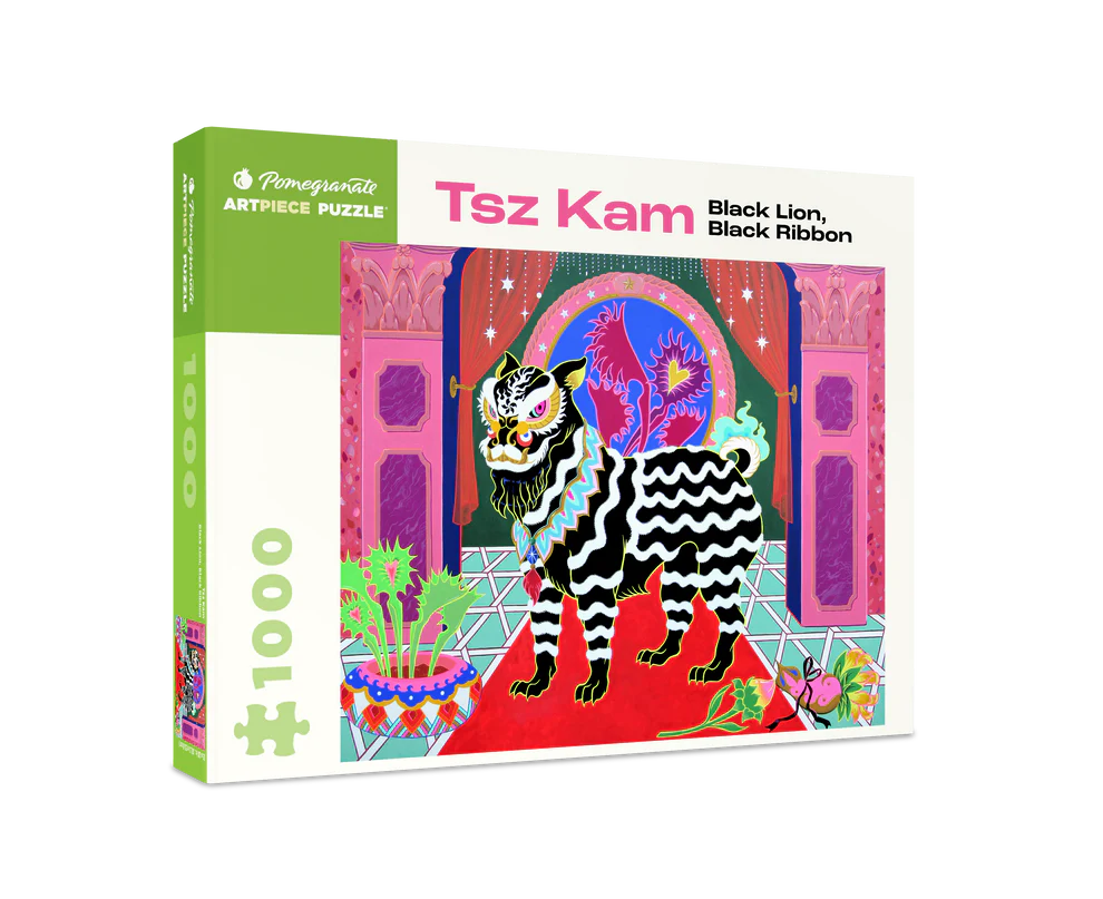 Born in Hong Kong, Tsz Kam creates extravagant art that magnificently wrestles with conventional beauty standards, global politics, and gender fluidity—all with a flair for fantasy in supernatural color. After moving to America as a teen and pursuing an art degree at the University of Texas, Kam has built a reputation in the Austin art scene. This image titled Black Lion, Black Ribbon is a protest piece valuing the freedom and democracy that are afforded in the United States. Bursting with symbolism of both Hong Kong and Texas in the colors, plants, and architectural elements, it centers around an enchanted Cantonese lion. Discover all the details as you assemble this 1000-piece puzzle.