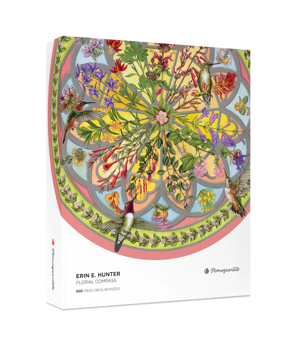 Erin E. Hunter’s Floral Compass is a paean to pollinators, an expression of her fascination with the cycle of life. From backyards to city park benches to botanic gardens, this scientific illustrator has studied the natural world, documenting such delights as hummingbirds sipping nectar from favored blossoms. As you pore over this 500-piece circular puzzle, revel in every feather and flower in Hunter’s “rose window” design wreathed by manzanita blooms.