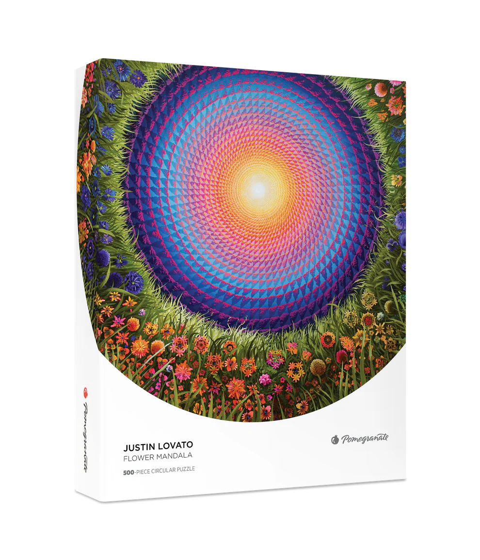 Combining natural forms and reality-bending geometry, Justin Lovato creates worlds that tear the fabric of space and time. His style—often demonstrated in massive murals—draws from mesmerizing optical art and surrealism. Lovato contends that his work is inspired by the “atomic soup of the natural universe.” Dip a spoon into this cosmic flower mandala and slurp up the details as you assemble this 500-piece puzzle.