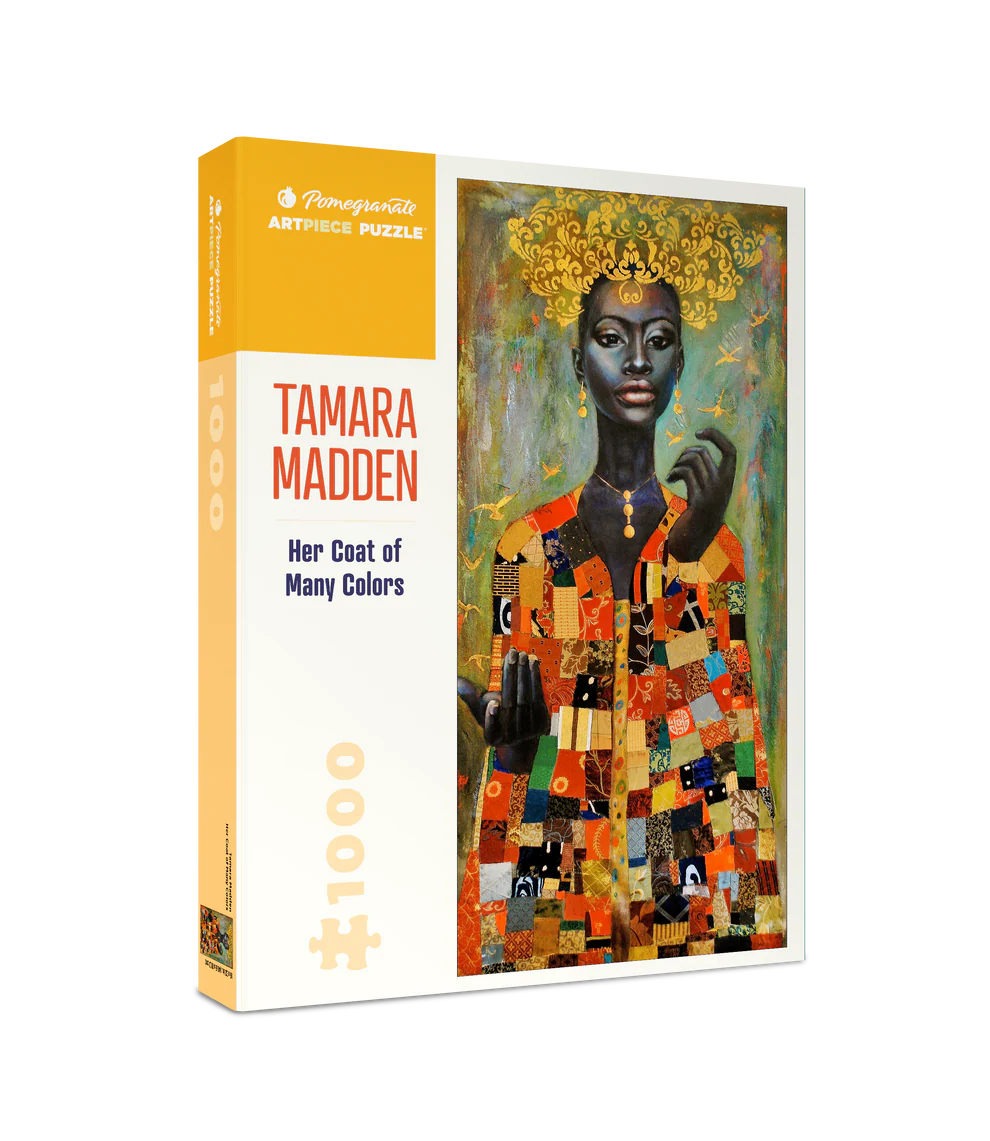 Tamara Madden was renowned for featuring Black women of the African diaspora in elaborate headdresses and lavish ensembles, and Her Coat of Many Colours is no exception. Madden’s mixed media technique brings this artwork to life: her use of muted colors in the background allows the different elements of the patchwork coat to dazzle the eye and the intricate details of the headdress to captivate. Take in Madden’s regal imagery as you assemble this 1000-piece puzzle.