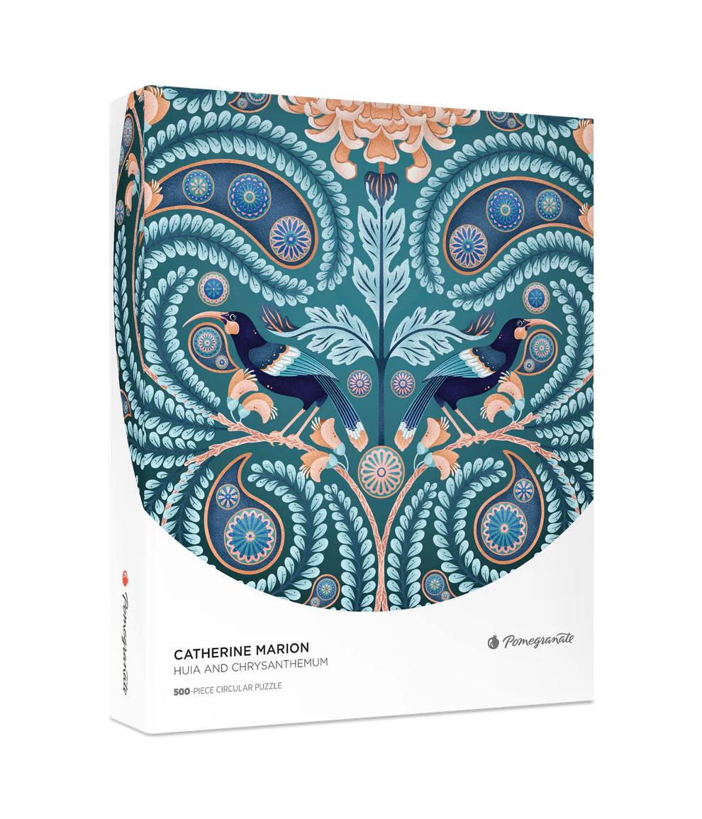 An intricate tapestry of flowers, foliage, and birds, Catherine Marion’s Huia and Chrysanthemum design is alive with movement and color yet evokes a meditative garden mandala. Her intention is to remind observers of the natural beauty that can sometimes be overlooked in our busy lives. Take a moment to slow down and enjoy the sense of peace while assembling this 500-piece circular puzzle.