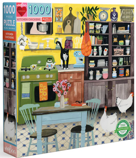Cluck Cluck Meow! Puzzle your way through eeBoo’s Kitchen Chickens 1000 Piece Puzzle. This charming country kitchen has a few friendly fowl and one curious cat. Jigsaw puzzles are a great activity for the whole family to enjoy. Featuring art by Anisa Makhoul (@anisamakhoul).