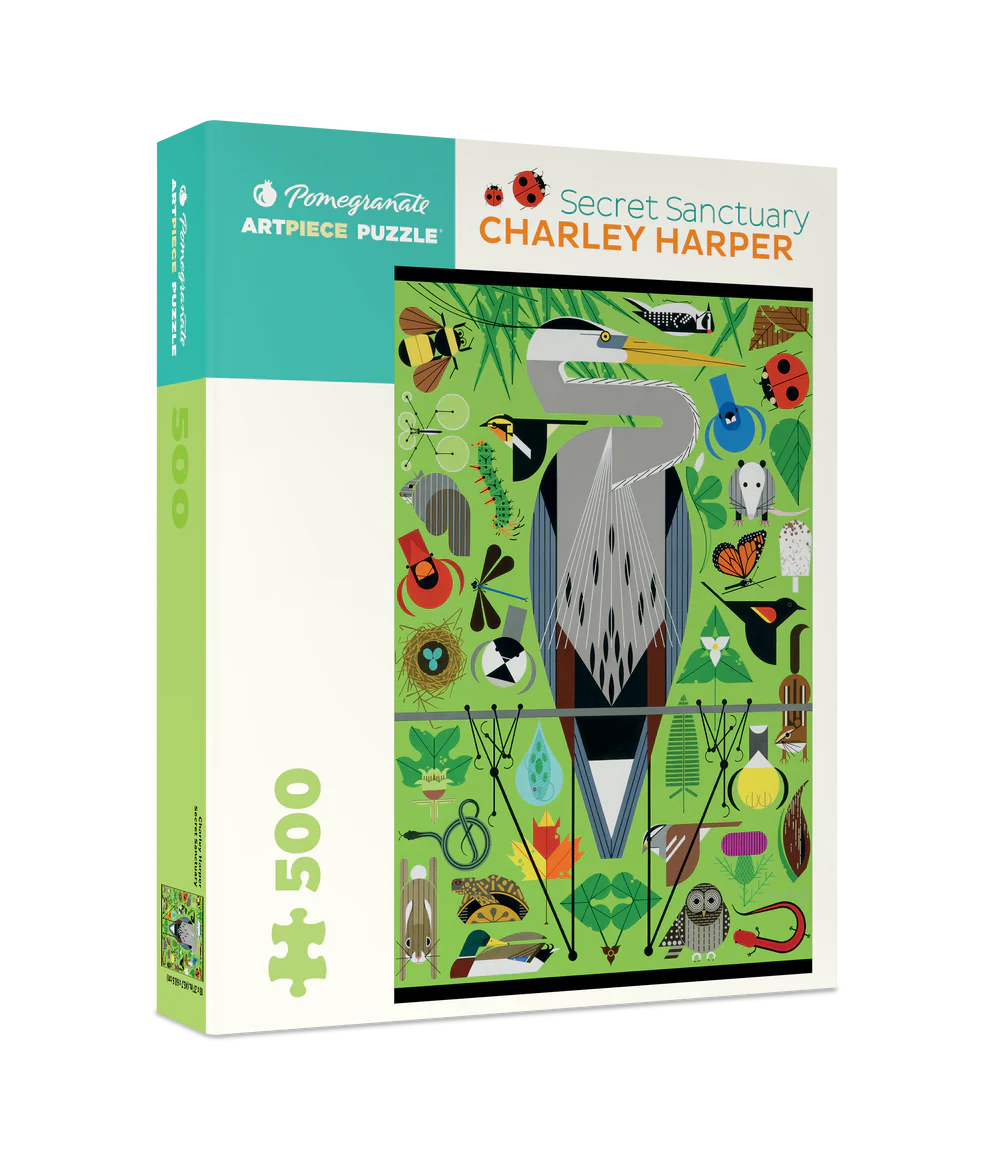 Charley Harper (American, 1922–2007) Shaker Lakes Regional Nature Center A lifelong artist and conservationist, Charley Harper expressed his deep appreciation of nature through his design, forming the groundbreaking “minimal realism” that would become his artistic hallmark. The image featured for this 500-piece puzzle comes from a 1991 poster for the Nature Center at Shaker Lakes in Cleveland, Ohio, created in celebration of the area’s wildlife and the center’s many years of “serendipity in the suburbs.”