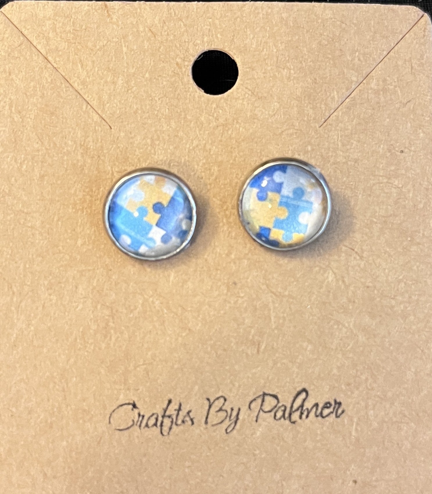 These sophisticated stud earrings feature a carefully crafted jigsaw puzzle motif in blue and yellow tones, set against a gleaming silver backing. Measuring 1/2 inch in diameter, they offer a subtle yet striking embellishment to any ensemble. Perfect for individuals who appreciate distinctive jewelry, they also make an intriguing conversation starter for puzzle enthusiasts.