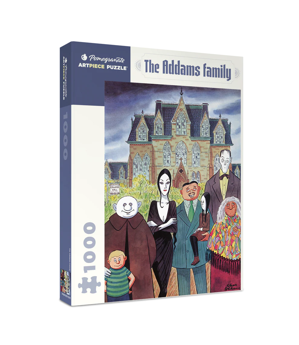The delightfully frightful Addams Family has tickled the dark side of the public’s funny bone for nearly 90 years. With the creation of Morticia, Gomez, Uncle Fester, and the whole quirky gang, Charles Addams put a satirical spin on the “ideal family.” His eccentric characters have become icons of popular culture, from cartoons in to television series, feature films, a Broadway musical, and much more. Revel in Addams’ deadpan wit with every piece in this 1000-piece puzzle!