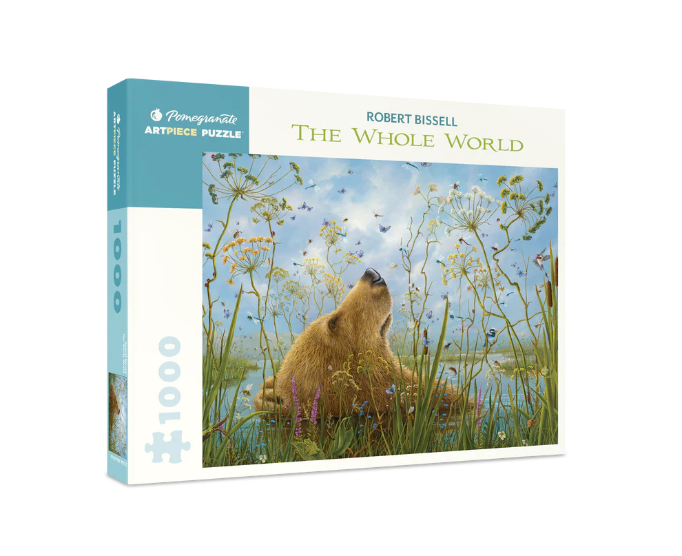 Robert Bissell The Whole World, 2014 Bissell’s bears—contemplative and curious—seem to lead lives as complex and thought-filled as those led by humans. His paintings invite a sense of wonder and appreciation for our precarious connection with the natural world. The lead character of The Whole World seems equally mesmerized by the vast sky and the tiny butterflies and dragonflies, while soaking in a calm lake. You’ll fixate on a ladybug or two, some bees, a snail, a hummingbird. and a jumping fish while piecing together this 1,000-piece puzzle.